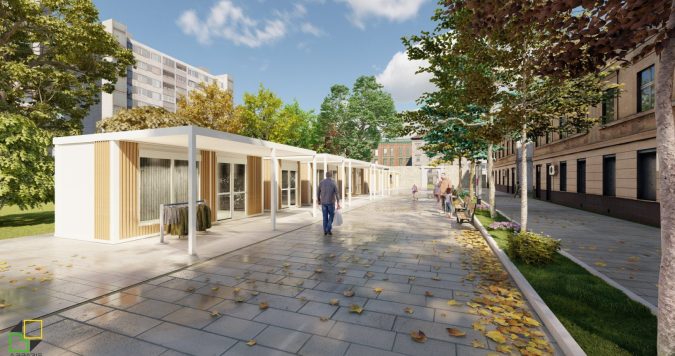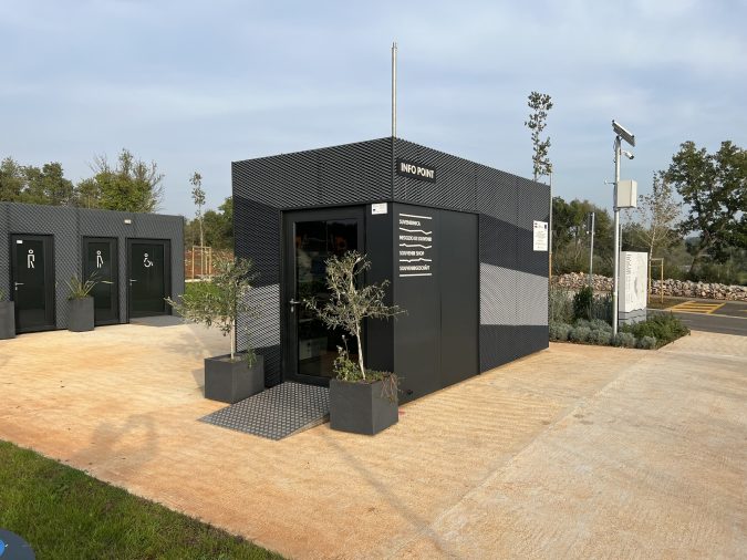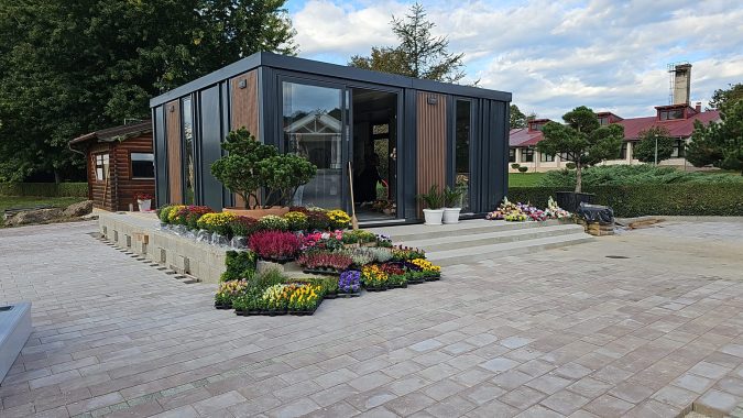 A prefabricated sales unit suitable for various retail activities. Sliding glass walls open the sales area to customers, while the opposite side features an enclosed section for uninterrupted work.